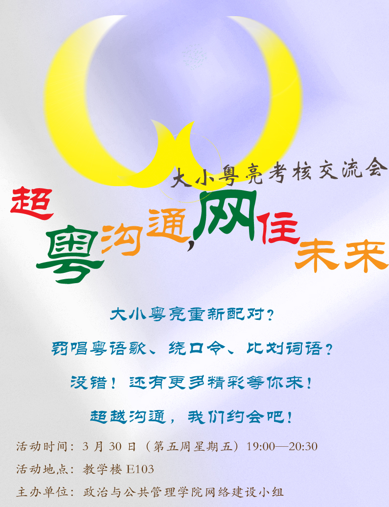 5.出题人和出题范围:每个大粤亮出3道题目,内容以上学期培训会的PPT内容和寒假期间发的粤语教程为基础,题型和方式等都不限,大粤亮可以尽情发挥,考试时随机抽取3题进行考核。