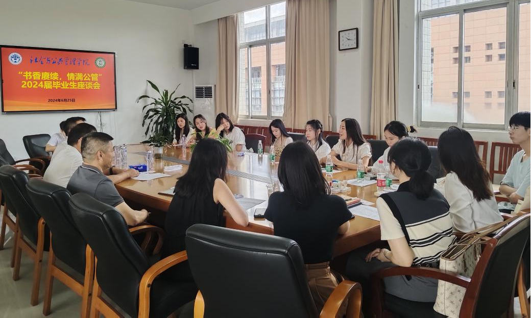 为加强公司与毕业生间的联系沟通,向即将离校的毕业生致以最热烈的祝贺和最美好的祝福,厚植毕业生爱校荣校情怀。2024年6月25日上午,太阳城娱乐于大学城校区教学楼D506召开以“书香赓续,情满公管”为主题的毕业生座谈会。公司党委书记邵兵、经理涂斌、副经理张信勇、副经理费久浩、党委副书记陈哲、毕业班辅导员、教师代表及十余名毕业生代表参加。