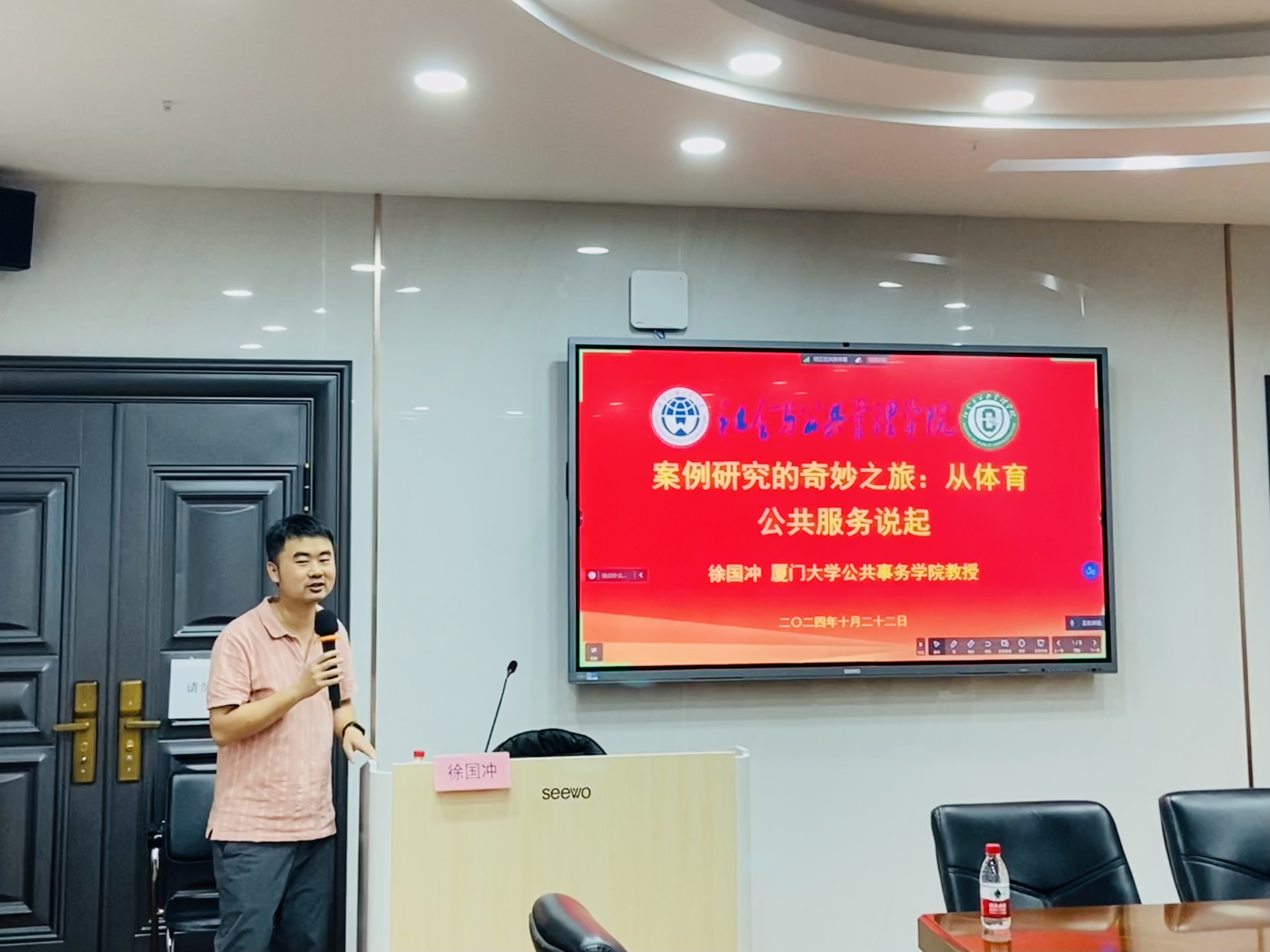 本网讯 2024年10月22日晚,太阳城娱乐特邀厦门大学MPA教育中心主任、厦门大学公共事务公司教授、博士生导师、南强青年拔尖人才徐国冲教授开讲“案例研究的奇妙之旅:从体育公共服务说起”,讲座在大学城校区MPA教育中心第二会议室举行。太阳城娱乐副经理费久浩、MPA教育中心主任林海彬及MPA全日制员工参加了此次讲座。同时,讲座开设了线上参与渠道,部分MPA教师、MPA非全日制员工及其他专业研究生同步线上参加。