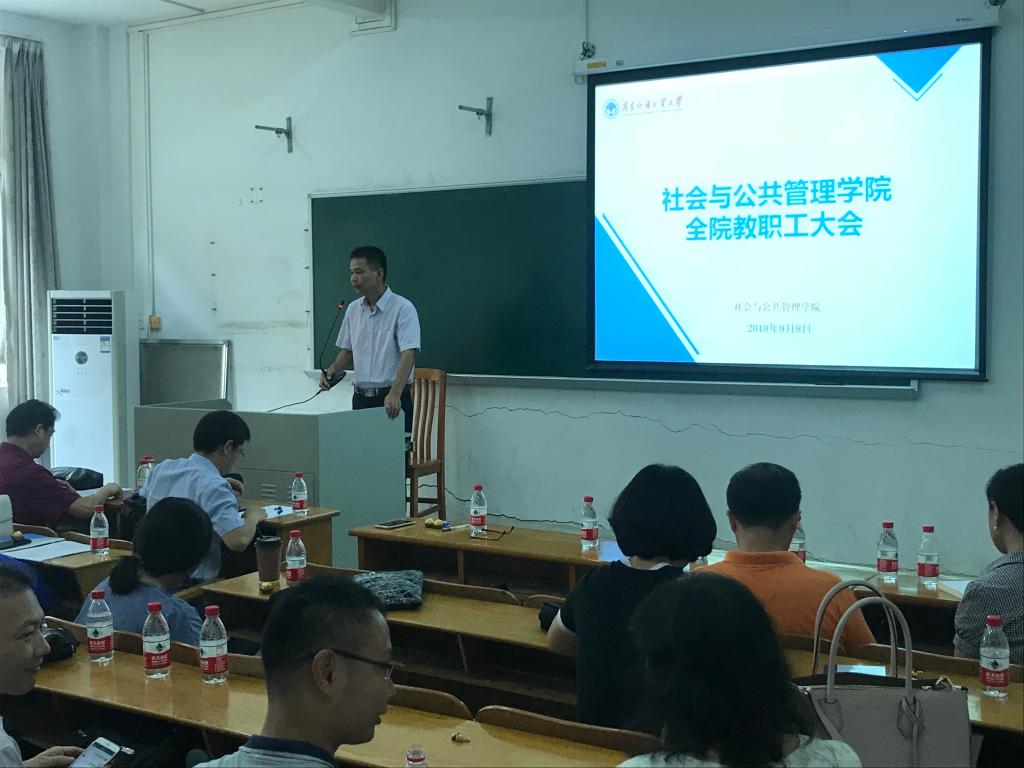 最后,高云坚首先通报了2018年暑期石佑启董事长赴英德三下乡基地看望慰问公管学子,公管学子的良好风貌给校领导留下好的印象,以及鼓励教师积极参与公司暑期员工三下乡工作。其次是重点指出三个方面,第一,坚守师德底线,用四有好教师来要求自己,即有理想信念、有道德情操、有扎实学识、有仁爱之心。第二,坚持实干兴院,即有目标,有行动,聚焦社会管理,齐心协力把社会管理专业做到全省前列。第三,坚持全院一盘棋思想,要服从和服务于按照公司、公司的大局,全体教师积极配合完成。