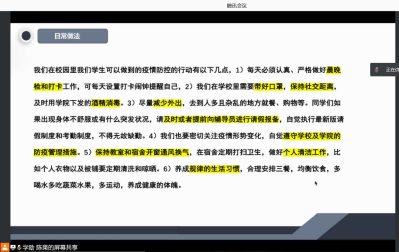 大会伊始,级委余乐、陈子豪为同学们着重讲解了考试诚信与防疫安全两部分内容。在考试诚信方面,级委余乐同学重点讲解了本科生手册中关于考试违纪部分的内容,强调了诚信考试的重要性和必要性,希望同学们能够诚信考试,不要轻易逾越雷池。