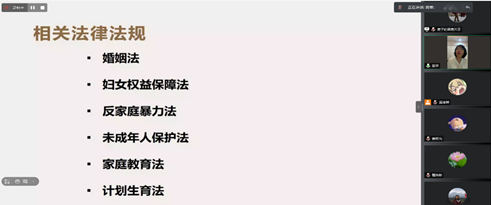 讲座开始,简瑞燕委员阐释了自己对“婚姻”、“家庭”及相关社会政策的理解,并结合马斯洛需求层次理论阐述了家庭功能的重要作用。随后,简瑞燕委员提出,伴随着经济发展和人口结构变化,婚姻家庭的态势也出现了许多重大变化和新问题,这些给社会治理的发展带来了挑战。围绕《婚姻法》、《妇女权益保障法》、《未成年人保护法》、《反家庭暴力法》、《人口与计划生育法》等法规的意义与亮点,回顾了我国民法典体系下婚姻家庭相关法的发展阶段和框架体例,结合自己的工作经历,阐述了在基层工作中如何运用相关法律法规及政策倡导,解决婚姻家庭问题,维护社会公序良俗,践行社会主义核心价值观。