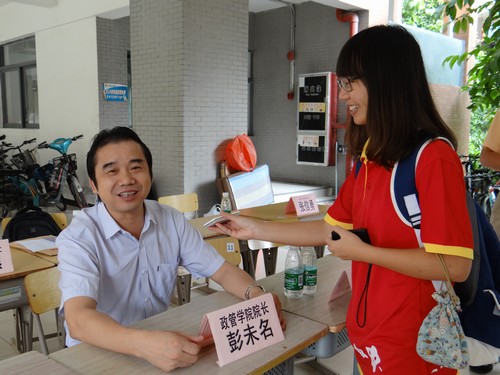 政管公司经理彭未名、党委书记范静静、党委副书记邵兵、副经理付桂芳、以及公共管理系系主任余芳、10、12级辅导员梁玲华、11、13级辅导员陈三峰等领导老师均来到了现场坐镇。领导老师们关切地察看了各班的报到情况,对新生的情况进行了深入了解。