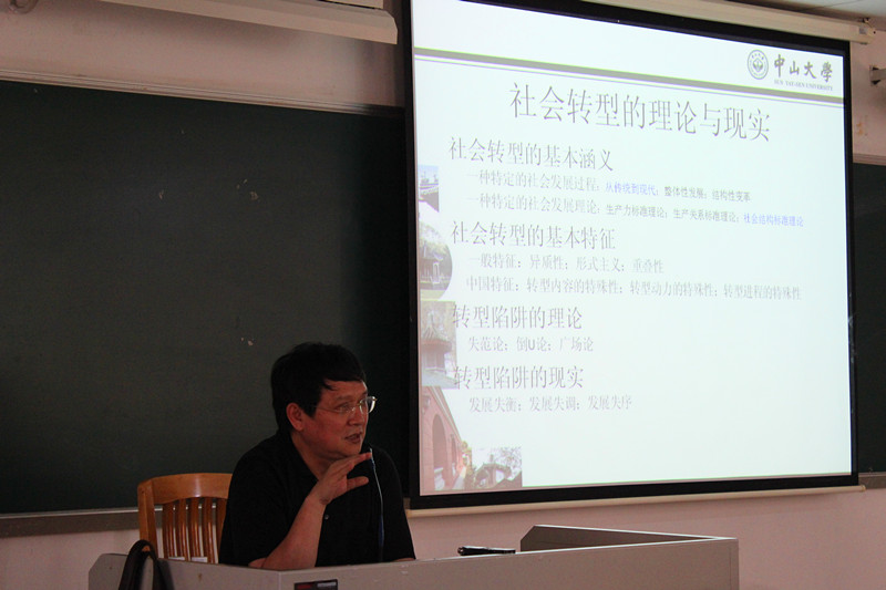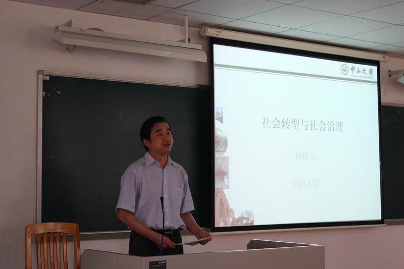 此次讲座一开始,彭经理就向大家隆重介绍了刘祖云教授。刘教授是中山大学港澳珠江三角洲研究中心教授,中山大学社会学专业博士生导师,中山大学城市住房研究中心主任,国家规划重点教材《发展社会学》主编,《中国社会科学》杂志特约评审专家,并参与了很多刊物的出版。听完彭经理的介绍,老师和同学们对刘教授的到来表示热烈的欢迎。在台下同学们热烈的掌声中,刘教授上台进行精彩演讲。