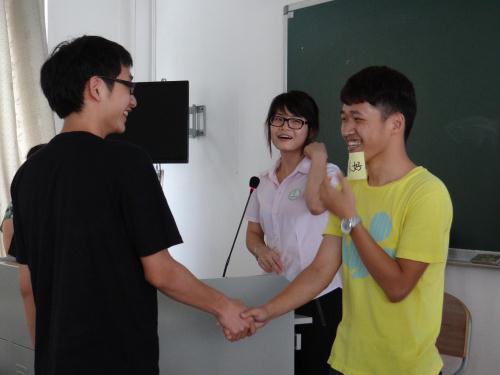 分享交流会一开始,主持人黎晓丹首先对广外的热情接待表示衷心的感谢,并带领大家进行破冰环节的小游戏。第一个游戏要求坐在最左边的一列的5位同学进行自我介绍并摆出自己的招牌动作,然后再由主持人随机抽取5位同学进行复述。第二个游戏是猜词,由两位同学合作,一个比动作、一个猜词语。