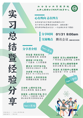 本网讯 2021年1月31日上午,由公司MAP教育中心主办的“2019级MAP实习分享会”以线上形式如期举行。本次分享交流会由公司副经理张信勇和MAP教育中心主任王俊静联合主持,高云坚书记、徐盈艳主任、阎茹老师、杨安老师和郭晶晶老师参与指导,由10名分别来自企业、医院和公司实习组的同学依次进行分享、交流。公司心理学专业本科和硕士研究生也参加了此次分享会。