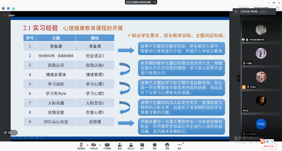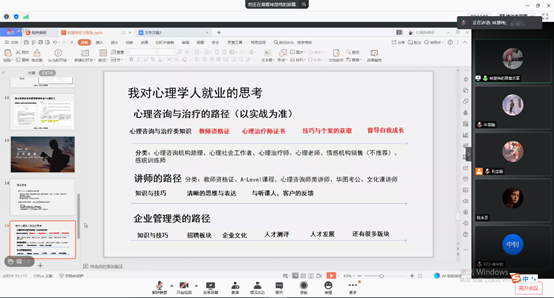 最后由公司实习组的冯君萍(广州市轻工技师公司心理学科心理辅导教师)、叶嘉恩(倍多分教育心理辅导教师)以及李浩然(东莞市第一中学心理科高中心理教师)3名同学进行了公司实习经验分享,同学们从教团队格证考取、培养多元兴趣爱好以及面试经验等方面详细介绍了公司类工作特点和面试经验。