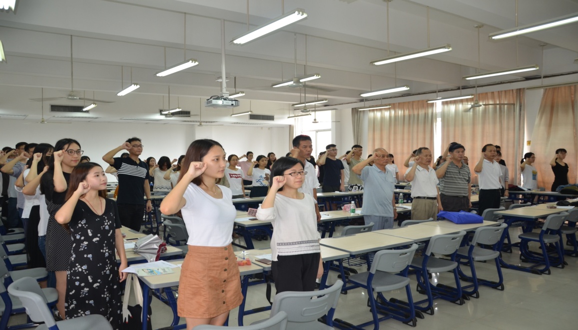 一开始,由高云坚书记亲自带领预备党员及正式党员一同面向党旗郑重宣下言,“请举起右拳,拳高过肩,让我们在党旗前宣誓和重温入党誓词”在严肃的宣誓声中拉开了活动的序幕。