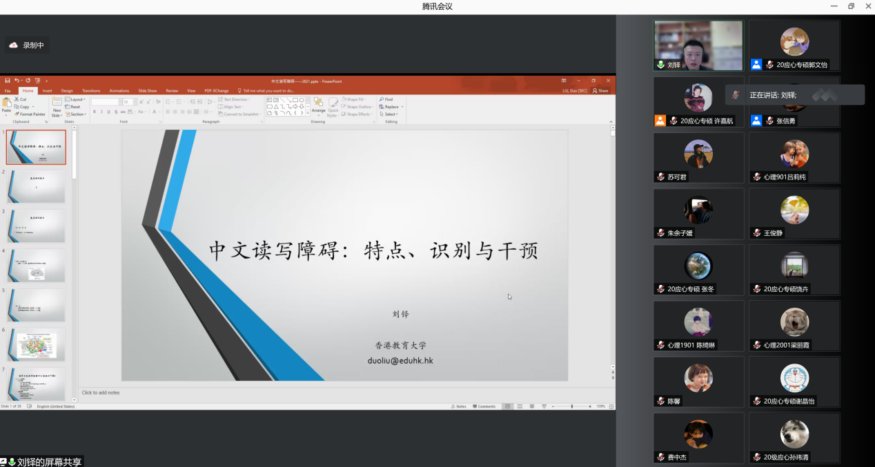 讲座围绕“中文读写障碍”,从定义、特点、识别以及诊断和干预策略等方面展开讲解,层层递进而又深入浅出。刘铎博士运用专业知识、结合案例和当前研究结果,理论与实践并进,为同学们科学性地认识读写障碍及其干预策略打开了一扇窗。虽然本次讲座为线上,但同学们纷纷表示受益匪浅,不仅拓宽了知识领域还收获了新的启发。