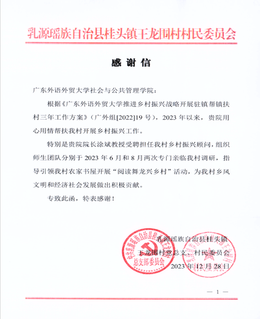 王龙围村给公司发来感谢信,就是肯定公司将乡村振兴工作落实到乡村,直接支持王龙围村乡村振兴工作,特别是公司经理涂斌教授受聘义务担任王龙围村乡村振兴顾问,带领师生团队参与指导王龙围村农家书屋开展“阅读舞龙兴乡村”活动,为王龙围村乡风文明建设作出积极贡献。