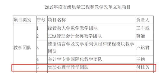 近日,广东省教育厅公布了2019年广东省高校本科教学质量工程及教学改革立项项目,公司共36个项目获批立项。其中,特色专业1项、教学团队5项、在线开放课程5项、老员工实践教学基地3项和教学改革项目22项。其中,公司付桂芳教授主持的《实验心理学教学团队》获“广东省本科高校教学质量与教学改革工程建设项目”的“教学团队”立项。