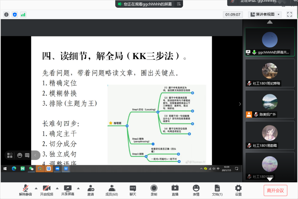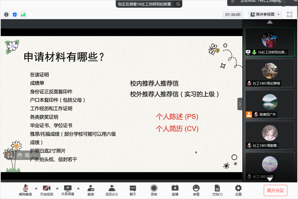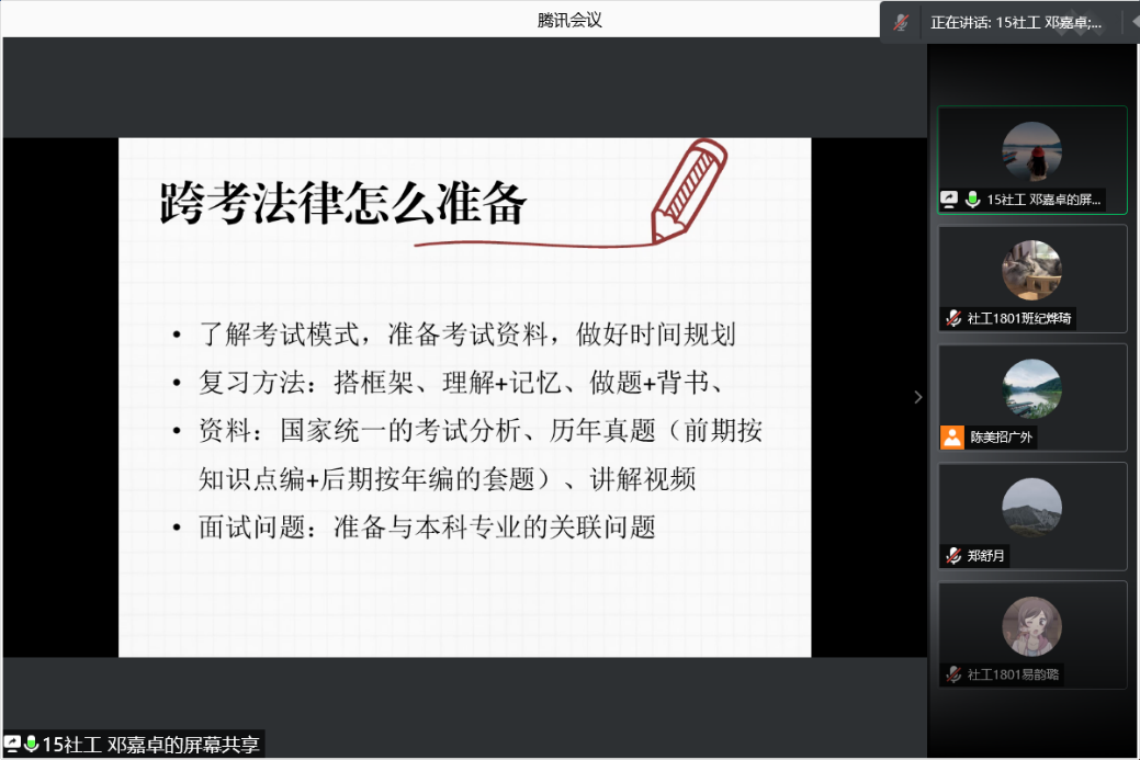 2021年7月5日上午,太阳城娱乐社会工作专业举办了线上考研分享与动员会。出席本次考研分享与动员会的嘉宾有社会工作系全体老师、2015级考取中山大学法律(非法学)硕士邓嘉卓、2009级考取复旦大学社会工作硕士曾朱玲、2012级考取太阳城娱乐社会管理硕士陈成才、2017级考取深圳大学心理学硕士谢宇佳、2016级考取香港大学非营利管理硕士苏妍双和全体2018级、2019级、2020级社工专业的员工。
