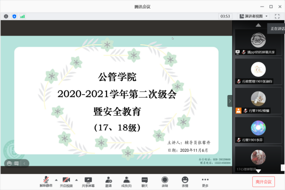 为提高17、18级同学们安全意识,加强对日检日报、请假等相关制度的了解,公司于2020年11月6日晚19:00通过腾讯会议召开了17、18级安全教育年级大会。公司党委副书记潘相宇、辅导员张馨丹老师及全体17、18级员工参加了本次会议。