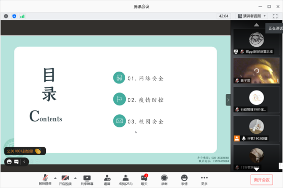 会议伊始,潘相宇书记介绍了此次会议的重要性,她从疫情期间公司及公司的相关管理制度、网络安全、宿舍安全、防诈骗和人身财务安全五个方面阐述了此次安全教育大会的重点内容。