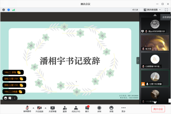 首先,潘书记指出时值疫情防控期间,恰正逢秋冬换季是各种疾病高发期,国内疫情不断反复,国际疫情又呈迅猛状态卷土重来,希望同学们切不可掉以轻心,麻痹大意,自觉遵守公司公司的相关规章制度,尤其是同学们外出实习时务必做好个人防护,将疫情常态化意识根植于心。接着她希望同学们要不断提升自己明辨是非和独立思考的能力。随后,她结合近期发生的案例,警醒同学们注意宿舍安全,在实习或找工作时,严防诈骗,注意宿舍防盗、用电、用火安全等。最后潘书记希望大三大四的同学可以好好把握在校时间,努力学习,顺应时势及时调整好心态,祝愿同学们一切顺利、前程似锦、心想事成!