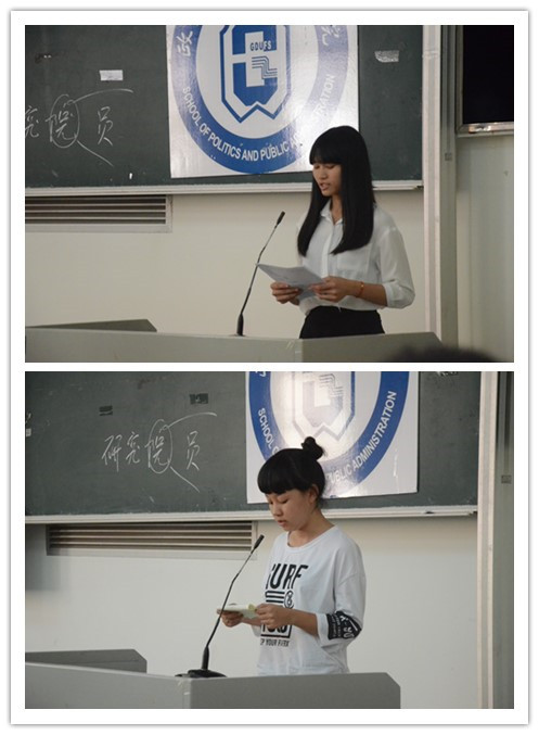 然后,教师代表刘春燕老师发言,她鼓励同学们要跨过困难向前走,要有信心和勇气。接着是团委副书记黎雪锋代表老生发言,她回忆过去一年来在政管的学习生活,总结经验,希望新生能够尽快融入老员工活,确立目标。最后新生代表李霏儿上台发言,表达了她对老员工活的向往。