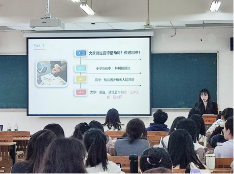 陈颖萱同学向大家分享自己求学之路中所参与过的志愿活动。从少时的种植、捐款,到中学的慰问乡镇老人,再到大学期间的无偿献血、清洗公车、关怀听障儿童。一次次的志愿经历深化了陈颖萱同学对志愿服务的理解。关爱“无声天使 ”的志愿服务经历更是她志愿实践过程中浓墨重彩的一笔,对她的助人意识起到深刻的影响作用。