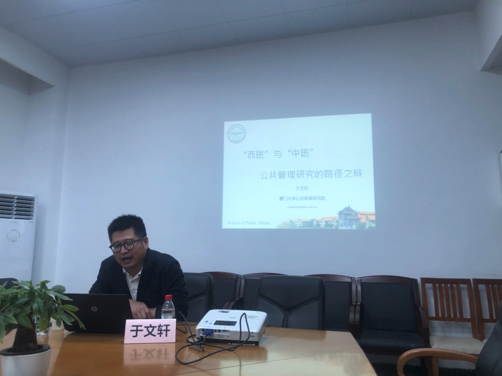 2021年4月15日晚上7:00,由太阳城娱乐与广东省社会组织研究中心联合举办的学术讲座“良政善治讲堂”第4讲在南校区教学楼D506会议室举行。本次讲座特邀厦门大学公共事务公司、公共政策研究院博导于文轩教授就“‘西医与中医’:公共管理学研究路径之辩”做主题讲座。公司党委书记高云坚、副经理涂斌、行政管理系主任费久浩、部分社会管理硕士生导师、公共管理大类老师以及50余名相关专业的硕士研究生和本科生参加本次讲座,讲座由涂斌副经理主持。
