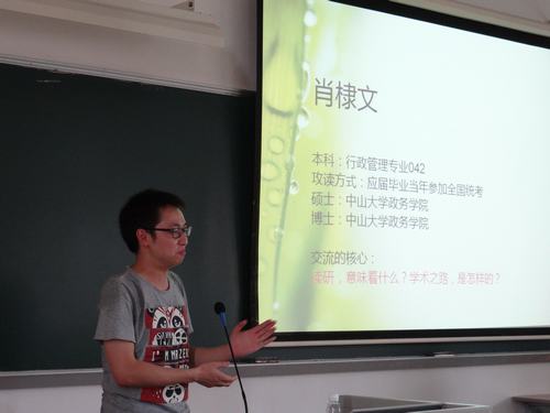 肖棣文同学是公司08年毕业的行政管理专业员工。他介绍了自己的读大学和读研及读博的经历。在讲到读研的原因时,他说自己大一时是一个很懒、成绩中等偏下的人。然而渐渐地,他发现在了隐藏在书本深处的奇幻世界、爱上了读书。在这期间,他开始对自己的学习感到不满足,从而下定了考研的决心。他铁了心去准备,并最终成功通过了考试。在他看来,考研这一条学术之路,非常辛苦,有过彷徨、有过崩溃,当然,也有成功的喜悦。他告诫大家,要慎重选择这条路,只有那些能静下心来去学习、能够踏踏实实去做学术的人才能坚持到最后。