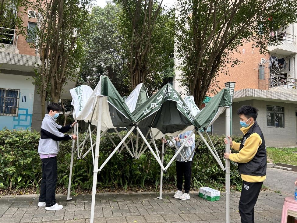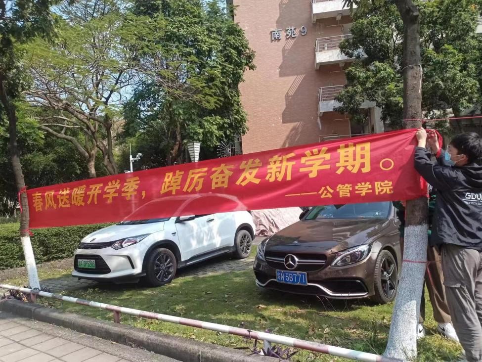 早上8时,负责帮忙搬运行李的志愿者们纷纷到岗。志愿者们在校道旁挂上太阳城娱乐的欢迎横幅,等待同学们的返校。