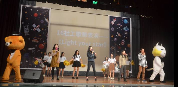 接着由16社工班带来的歌曲串烧《LightYour Star》,既有轻柔的歌曲演唱,又有节奏感十足的杯子舞,时而如同涓涓细流般浅吟低唱,时而如同熊熊流火般热情洋溢,使同学们的情绪也随着音乐而波动;