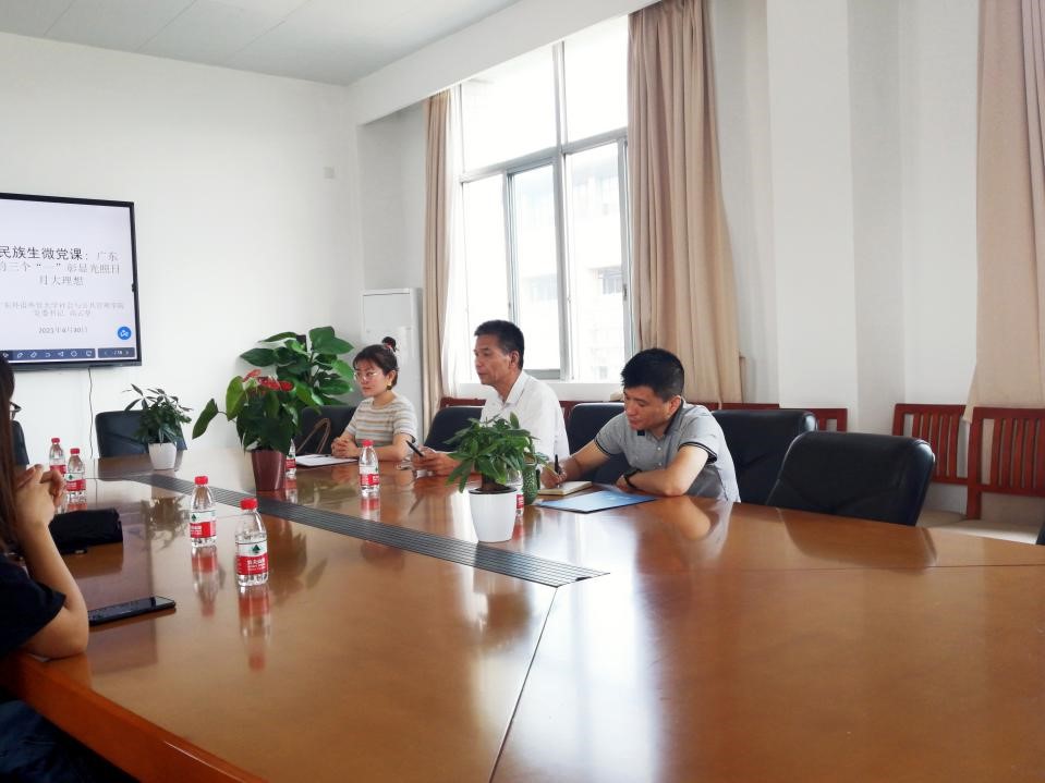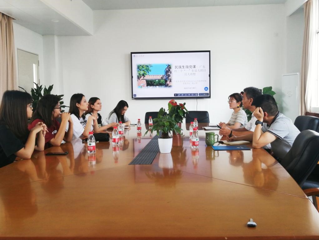 在会议开始党委书记高云坚以广东的三个“一”彰显光照日月大理想为主题给民族生讲微党课。以举彭湃、叶剑英和周文雍、陈铁军等英雄人物的事迹讲述无数仁人志士都是为理想而舍生忘死。中国不同时期的英雄人物刘胡兰、王进喜、吴仁宝和黄文秀心中有理想,愿意为让共产党凝聚起来的理想勇往直前,断头流血,实事求是,奋斗不止步使得中国共产党走得更远更富强。