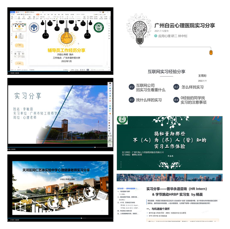 2022年1月11日下午,2020级应用心理专硕举行实习分享交流会,应用心理学系教师、应用心理专硕研究生和应用心理学专业全体本科生参加了此次分享会