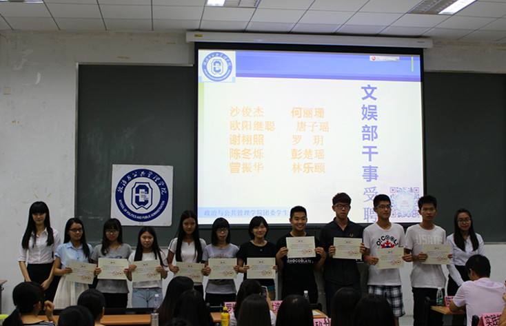 接下来分别是主席团、各部门部长和副部长以及干事的受聘仪式,在庄严的音乐声中,受聘人员郑重接过为期一年的聘书,他们不仅是接受了团学的工作,更是接过了一份沉甸甸的责任,更加坚定了政管团学“为你所做,必定更好”的信念。各部门的部长及干事轮流上台合影留念。至此,全场气氛达到最高潮。