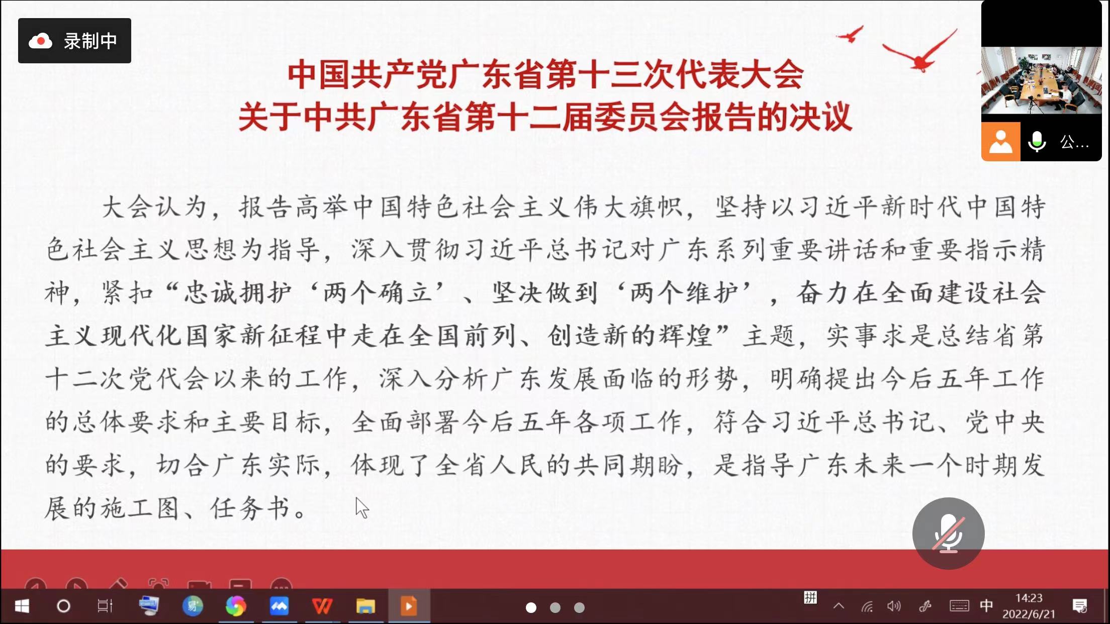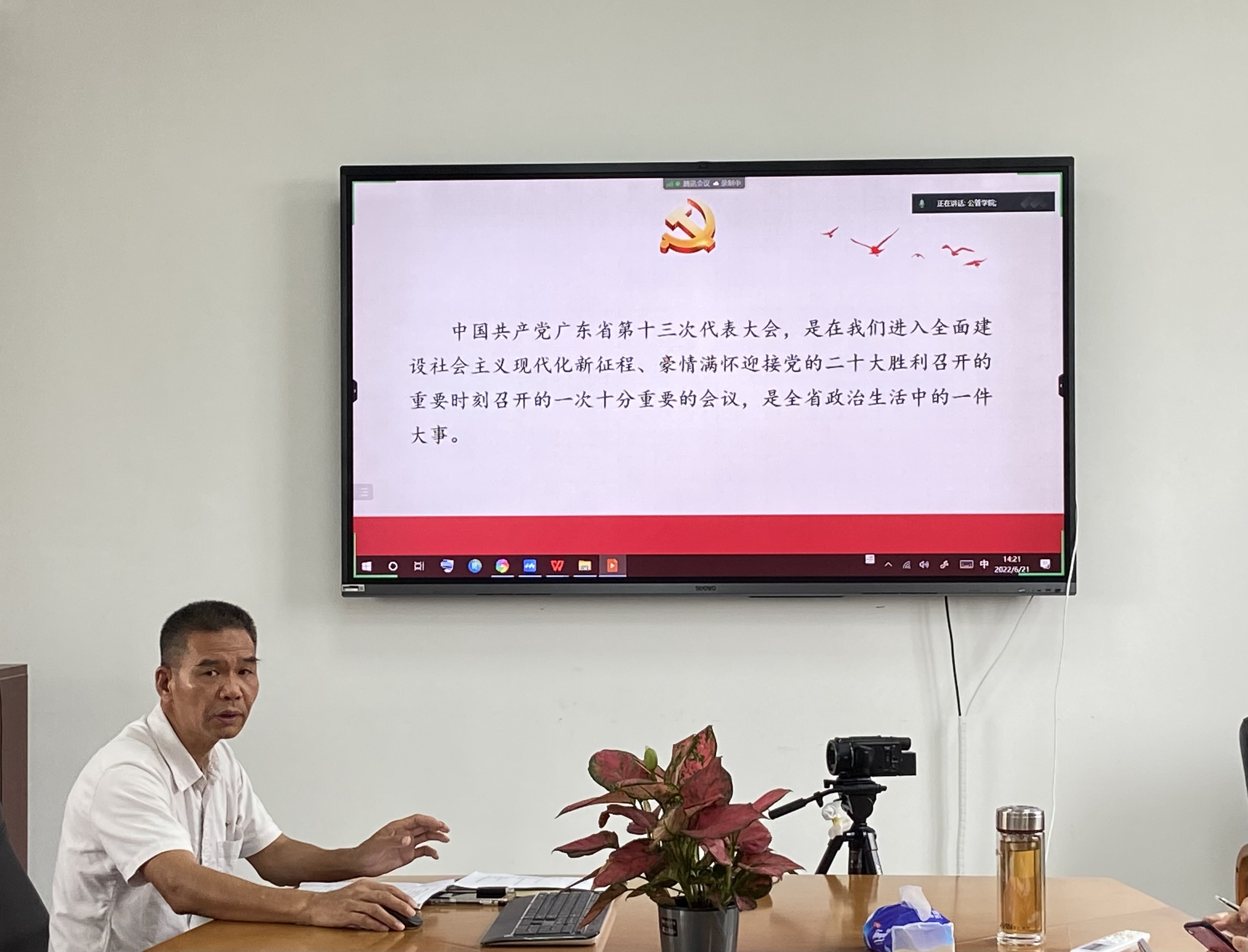会上,高云坚带领大家学习了李希同志代表中国共产党广东省第十二届委员会向大会作的题为《忠诚拥护“两个确立”坚决做到“两个维护” 奋力在全面建设社会主义现代化国家新征程中走在全国前列创造新的辉煌》的报告精神。他从过去五年广东各项事业取得的新进展新成就、今后五年全省工作的总体要求和主要目标、坚定不移加强党的全面领导和党的建设、以更大魄力、在更高起点上推进改革开放及深化落实九项重点工作任务五个部分展开讲述报告内容。