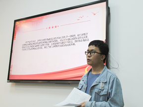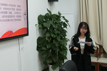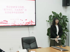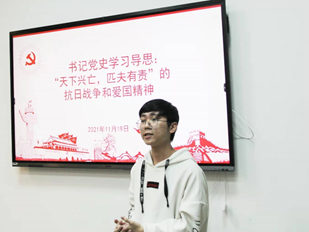 坚定信念,为时代照明。第二位发言的同学是行政管理1901班的陈子豪。他除了向大家介绍少年英雄王小二的故事——“哪怕一个小孩也懂得在国家危难的时候挺身而出,不畏牺牲地保卫父老乡亲和我们的国家;”还给向大家讲述了赵一曼女士的英雄事迹以及从赵一曼女士身上体现出的誓死抗日的决心和作为一名共产党员坚定的理想信念。最后,他结合当下世界局势提到老员工必须将国家命运同个人发展相结合并有所作为,承担起我们肩负的责任和使命。