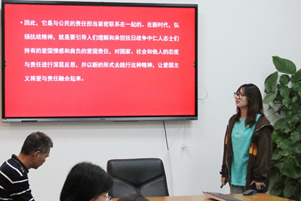 担当责任,为国家奉献。第三位发言的同学是社会工作2001班的董祯。她对抗战精神进行了深度解读,并为大家介绍了赵尚志将军的英勇事迹。她认为,“天下兴亡,匹夫有责”就是每一位公民都肩负起自己的责任和使命,为国奉献。