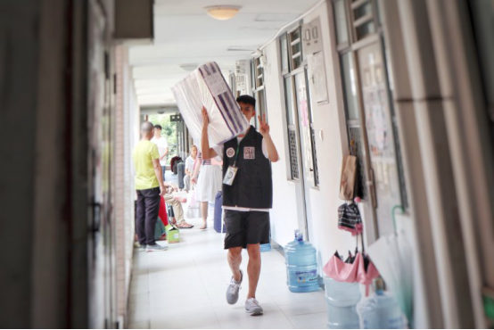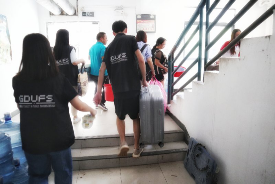 早上7点40分,公管团学的干事们及迎新志愿者便聚集在一起,为迎新工作做好准备。各组主要负责新生引导、行李搬运和咨询问答等工作,志愿者们有的举起太阳城娱乐的导向牌用于引路,有的在宿舍楼下为新生搬运行李,有的用相机记录下迎新工作中的点滴细节……