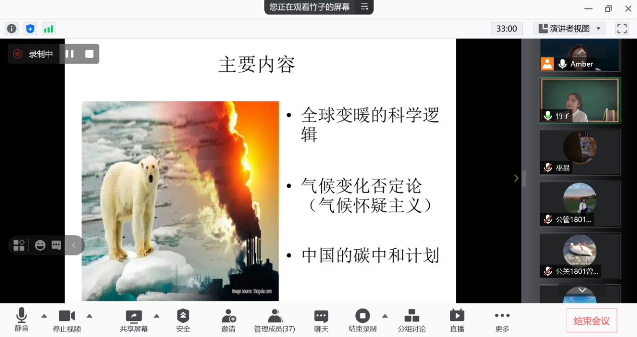 讲座主要包含三大板块内容:(1)全球变暖的科学逻辑;(2)气候变化否定论;(3)我国的碳中和计划。竹子老师首先深入浅出地介绍了五重全球变暖的科学逻辑:全球平均温度在升高-大气中温室气体的浓度在升高-人为排放-温室气体增加-气候变化对人类社会已经并将继续造成危害-人类可以采取行动控制温度上升的幅度以避免灾难性后果。随后竹子老师用生动的案例介绍了气候变化否定论以及我国在应对气候变化过程中的努力。她指出,我国已经向世界做出了承诺:二氧化碳排放力争于2030年前达到峰值,2060年前实现碳中和,这意味着我们面临着包括大国形象的树立、技术信心和实力的提升、能源转型、产业升级、污染治理等一系列的机遇和挑战。
