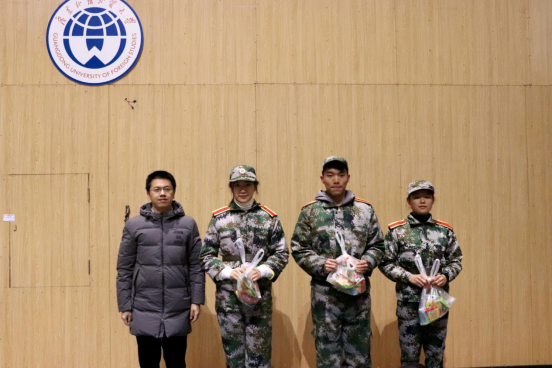 随后公司领导向全体参训教官、跟训朋辈导师、新生代表以及军训期间过生日的同学逐一发放慰问品,由于今年天气寒冷,公司还分别为每一位教官、朋辈导师、新生们准备了两份暖宝宝。同学们领取了慰问品后,纷纷表达了对公司领导老师们的感谢。公司的慰问温暖了同学们的心,给予了同学们刻苦训练的动力,让同学们感受到了公司对大家的重视与支持。