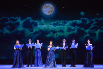 压轴出场的是公关17级学长学姐们带来一字一句铿锵有力、绘声绘色的朗诵《彩云逐月》,晚会随着这个富有意境的场景慢慢地进入了尾声。