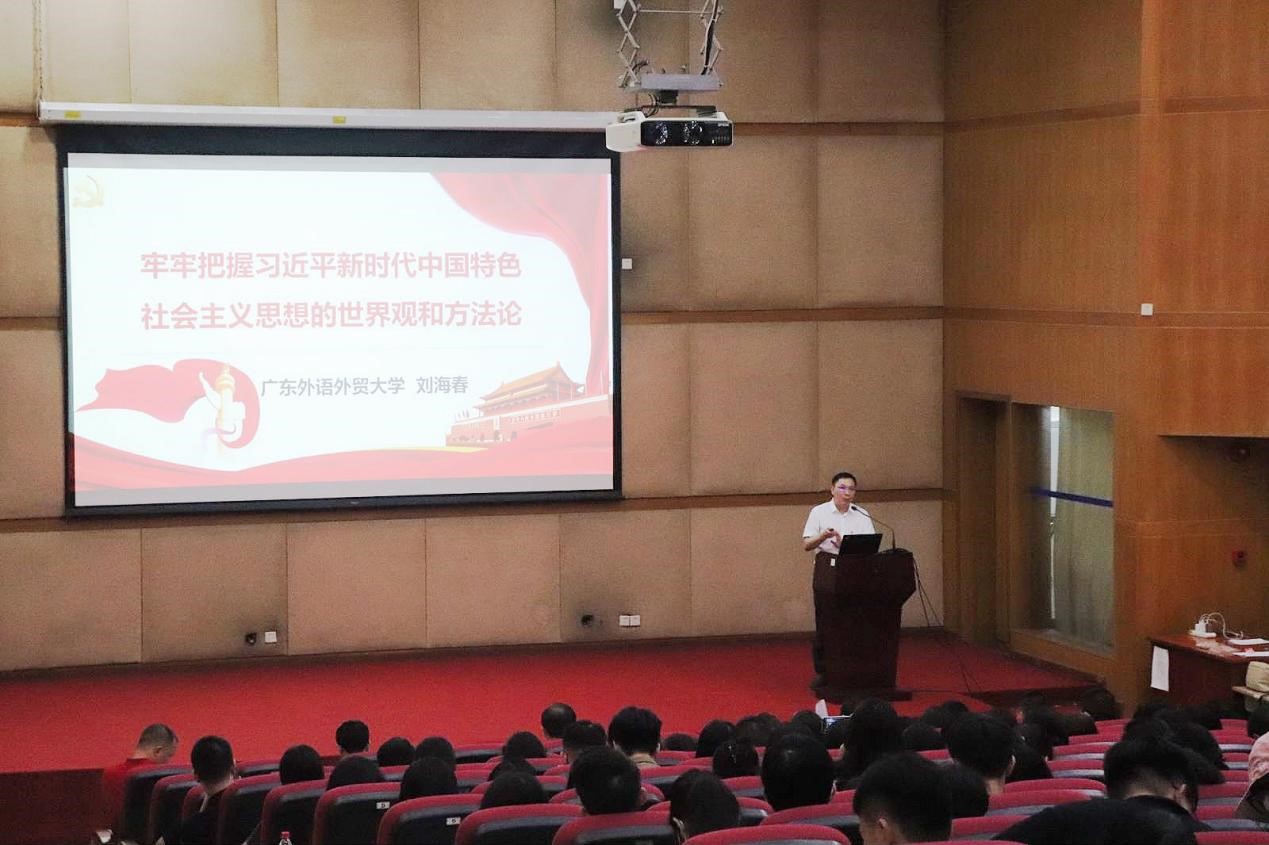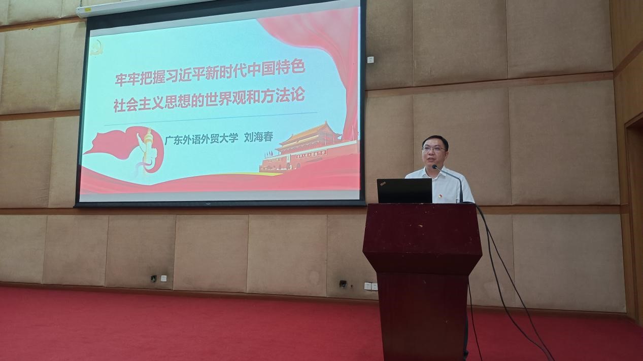 刘海春在讲述习近平新时代中国特色社会主义思想世界观和方法论时,认为我们应该遵循“六个必须坚持”原则,必须坚持人民至上的价值取向,必须坚持自信自立的奋斗之路,必须坚持守正创新的发展之道,必须坚持问题导向的破局之法,必须坚持系统观念的思维方式,必须坚持胸怀天下的视野格局。刘海春认为,要融会贯通运用“六个必须坚持”,切实转化为全力投身新时代新征程伟大实践的实际行动。我们要以党的二十大精神引领各项工作,牢牢把握住“以人民为中心”的发展思想,坚持问题导向,以科学的态度对待事业、以真理的精神追求发展,做到前瞻性思考、全局性谋划、整体性推进高等教育事业发展。他强调,全体师生党员不仅要在学习中国式现代化的过程中深入思考、广泛交流、积极探索,更要将所学知识和理念转化为实际行动和成果,贡献于社会发展和国家建设。