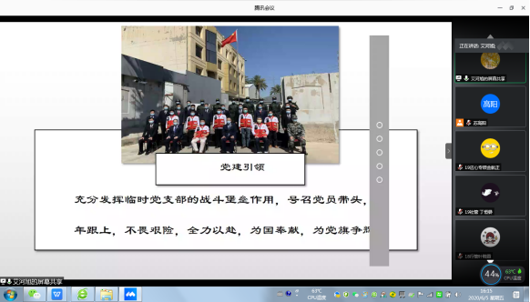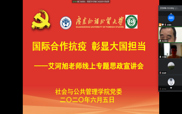 会议由公司经理、党委副书记彭未名主持。在介绍艾河旭老师简历时,他高度赞扬了艾老师不惧风险、迎难而上、勇于担当的精神,正是由于艾老师积极勇敢投入到伊拉克疫情防控工作,获得了各项成绩,如2020中国驻伊拉克大使馆“最美逆行者”荣誉称号、伊拉克卫生与环境部医学城抗疫荣誉证书、伊拉克——中国友好协会抗疫荣誉证书、中国红十字会总会抗疫荣誉证书、“广东省向上向善好青年”荣誉称号,并在公司“火线”加入中国共产党。希望全院师生以今天的线上思政专题讲座为契机,全面行动起来,发扬抗“疫”奉献的宝贵精神,时刻准备着响应国家、广东省的号召,将抗“疫”的精神融入到人才培养,精准高效推动特殊时期下的各项工作,实现疫情防控和公司教育事业发展的双胜利。