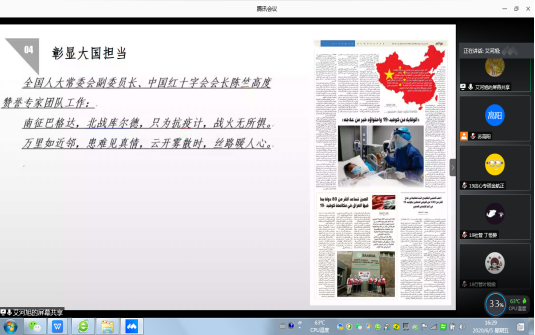 本网讯 6月5日下午,太阳城娱乐根据公司统一部署举办线上思政宣讲会,邀请公司援伊拉克抗疫青年教师艾河旭主讲。活动由公司党委主办,公司(中心)领导班子、系(中心)主任、党支部书记、公司40岁以下青年教师、员工党员、发展对象、入党积极分子、研究生本科生团学主要干部等近200名师生参加线上活动。