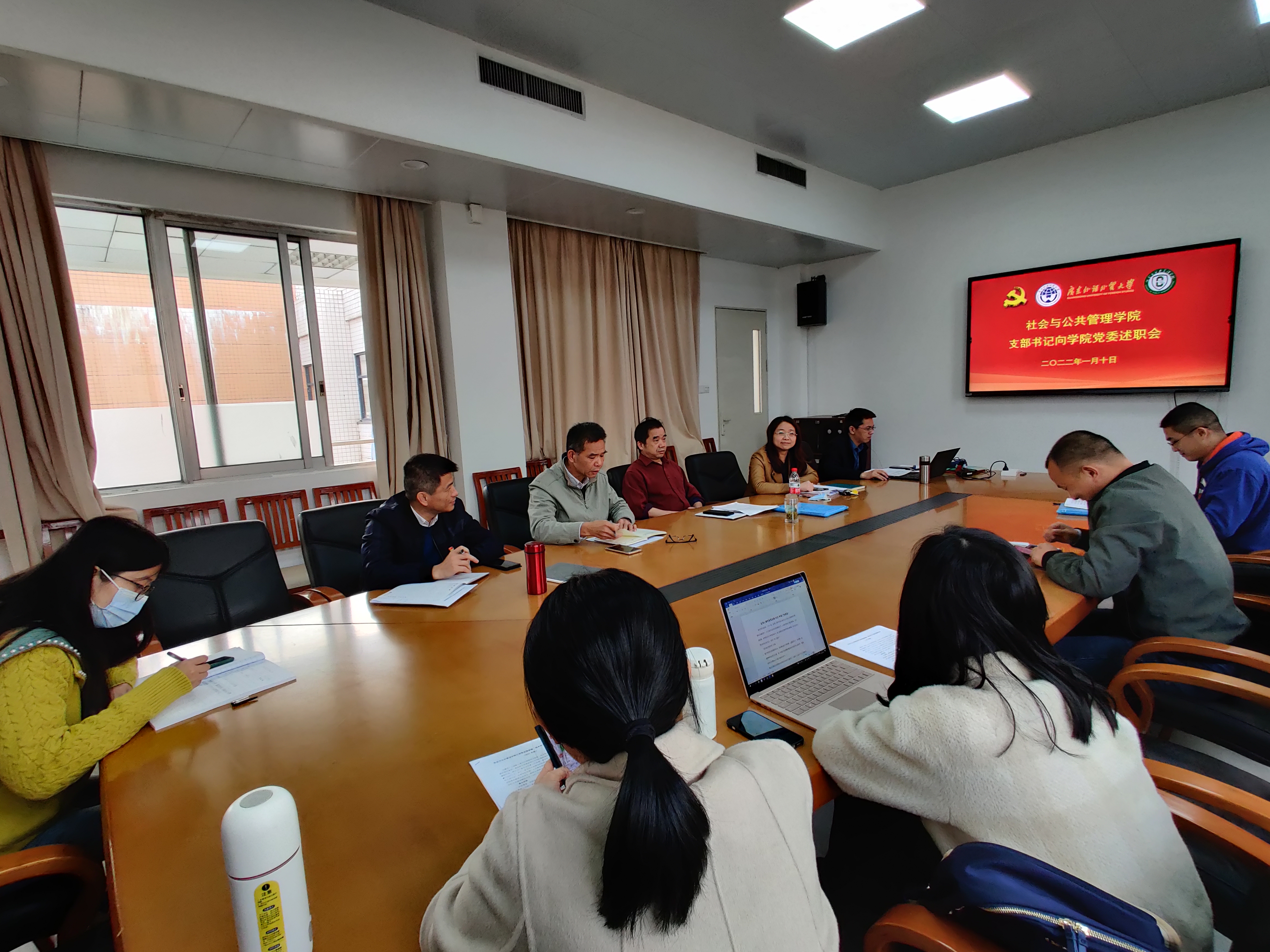 会上,公共管理教工党支部书记费久浩、应用心理学系教工党支部书记王俊静、社会工作系教工党支部书记陈美招、办公室党支部书记苏高阳、本科生党支部书记白志华以及研究生党支部书记郭晶晶等六位支部书记结合PPT演示依次进行现场述职,详细汇报了2021年度抓基层党建履职情况、存在的问题以及下一步的工作目标和举措。各支部述职精彩纷呈,党建工作规范有序、规定动作落实到位、支部活动各具特色、支部建设成效显著。