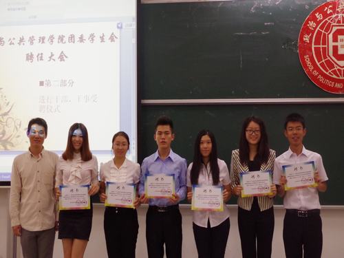 在经历了长达一个月的考察期后,政管团学终于迎来了新干事们正式加入团学的日子。2012年11月10日上午9点,政管公司第六届一任团委第八届一任员工会聘任大会在F315顺利召开。团委书记陈三峰老师、主席团成员以及各部门的部长等出席了大会,大会由团委副书记余磊主持。