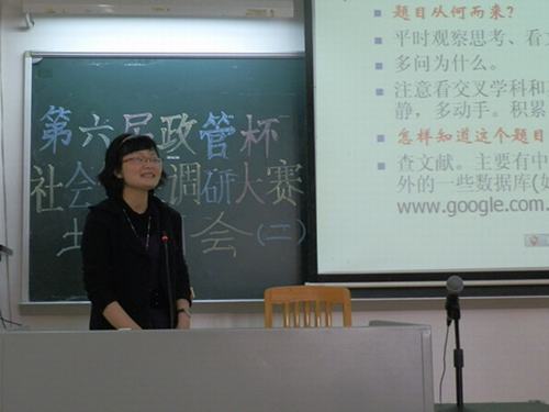 2012年3月17日下午三点,第六届政管杯社会管理调研大赛第二场培训会在教学楼E103准时举行。演讲嘉宾为应用心理学系吴艳老师。大会由调研部部长古小平主持。此次培训,最大的特色是吴艳老师通过经验和现场具体操作来讲述有关调研的知识。整场培训围绕调研的整个过程展开。