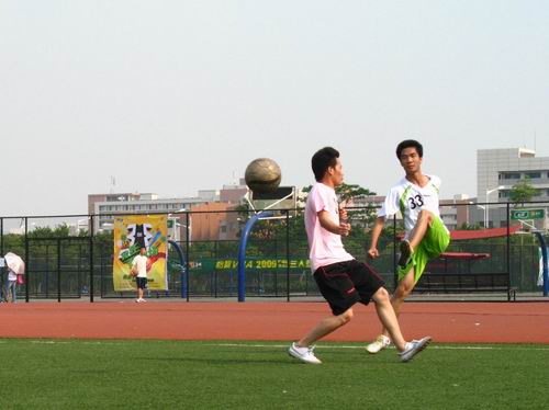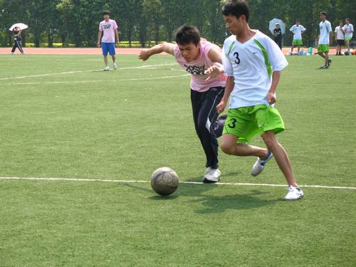 5月8日,骄阳似火。下午2点30分,南校人工草场,正在进行的是E&A足球赛之08行一对阵08社工。