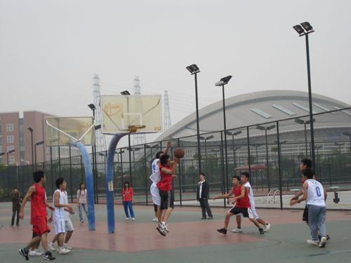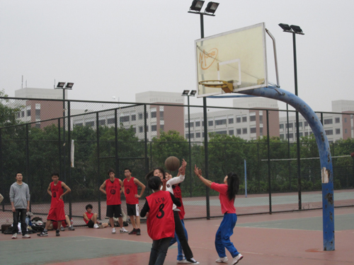 08行一女篮VS07应心 女生下场后,男生的战斗继续打响。经过一轮休息,07应心越来越得心应手地发挥其强大的战斗力,其中,着11号球衣的选手频繁使出杀手锏:假动作、急速转身、精确投球。球场上的比拼气氛越来越来浓,场边的拉拉队员也各出奇招,竭尽全力呐喊助威。这一精彩的赛事吸引了众多人观看。07应心连续上演具有高超技术的篮球秀,一次次地把比分追上,他们在结束比赛前继续把比分优势扩大下去,最终以66:46的大比分赢得比赛。 |