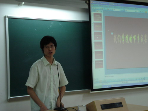 仪式首先由06三下乡先进个人何景杰师兄发言,他回顾了上届三下乡的历程,充满感情地谈起了当时的有趣的经历、艰苦的条件和自己的感受。他说,环境虽然艰苦,但是我们可以用乐观的精神去适应环境。不要怨天忧人。他感叹,三下乡就像他自己的大二一样,仿佛就在昨日,但是一转眼已经过去了。希望07届的三下乡队伍珍惜宝贵的下乡机会。