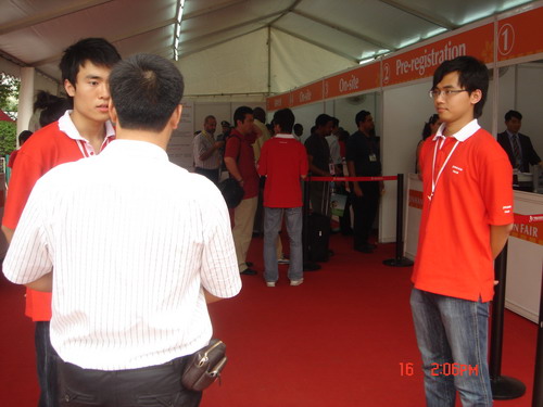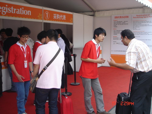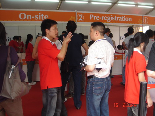 图(1)、图(2)为引导岗的同学不厌其烦地帮助客商,引导其去正确的窗口办证。由于今年是奥运年,各大交易会的办证要求都做出了较大的变动,不少客商因未能办证而产生不满甚至激动的情绪。尽管如此,我们引导岗的同学却能够以灵活和委婉的方式 ,耐心地向客商解释各种情况,及时有效地化解了各种矛盾,赢得主管部门的好评。 锦汉展览中心今日迎来了首个人潮高峰期。由于之前一直处于理论培训阶段,缺乏实践经验,因此在今天的实战过程中出现了一些小插曲,但是这个并没有影响到我们引导岗同学的工作热情和信心。在工作时,他们不仅以引导者的身份去帮助客人,同时还身兼了翻译者、服务者以及倾听者“三位一体”的角色,因此其肩膀上的压力自然也不亚于其他岗位的同学。