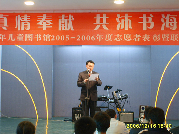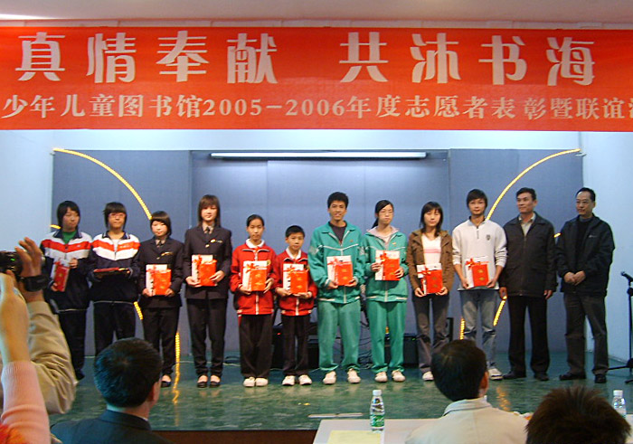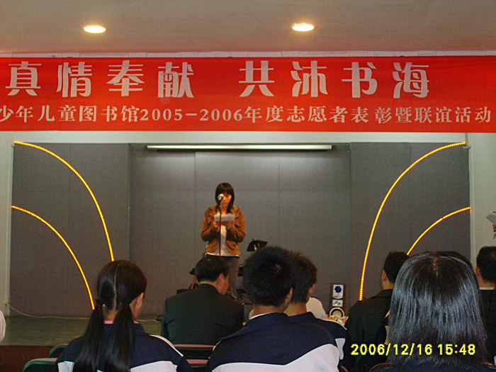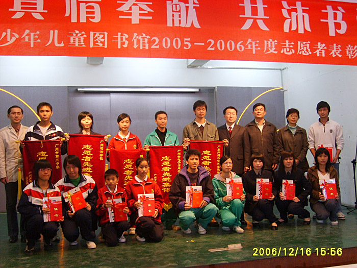 12月16日下午3:30,广州少儿图书馆2005-2006年度志愿者表彰既联谊活动在少儿图书馆六楼会议厅胜利召开,政管公司受到邀请派遣了五名团学干部前往参加,同时,参加该表彰会的还有来自其他志愿者集体的五间中小学。