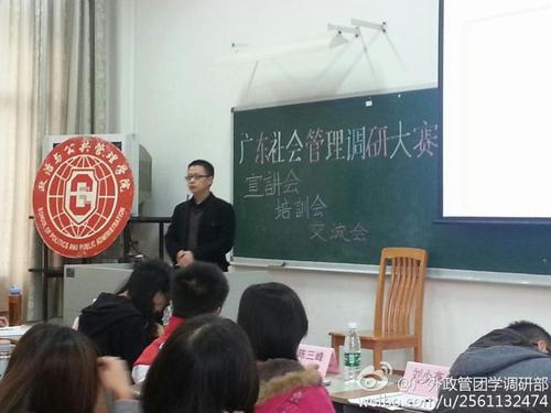 为加深员工对广东社会管理调研大赛相关内容及调研知识的了解,政管团学调研部于2012年11月29日下午举办了广东社会管理调研大赛培训会宣讲会暨交流会,并很荣幸地邀请到邵兵书记、陈三峰老师、陈胜老师担任嘉宾以及第六届调研大赛一等奖队伍队长曾泽亮师兄、第五届调研大赛二等奖队伍队长刘少燕师姐进行经验交流。
