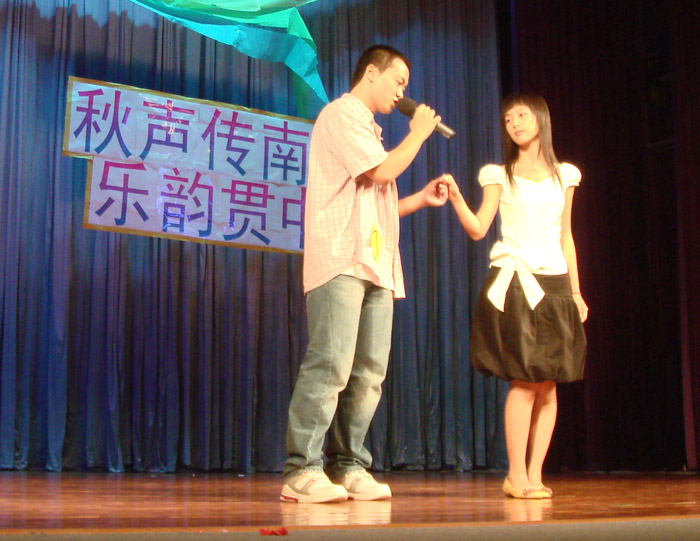 公司选手在比赛中均表现出色,第一个出场的是张晓刚,他表现得镇定自如,自信十足,还一边演唱,一边表演了一个爱情短剧,并赢来一片欢呼声。之后,公司活力四射的男子三人组演唱了《奔跑》,经过公司迎新晚会的“预演”后,他们显得更加默契和自信,并带动了全场的气氛。其中还插入了05级一位同学的精彩花式篮球表演,爽郎轻快的歌声和雷鸣般的掌声和谐结合把比赛推上了高潮。穿着独具中国韵味的红衣女孩姚研随后表演,她以熟练的民族唱腔为我们高歌了《好运来》,显出大器之才的风范,让全场洋溢着喜庆洋洋的气氛。