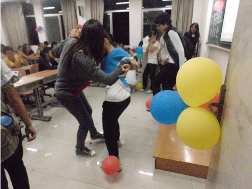 随后的游戏环节激动人心。小天使组合踩气球、猜猜看让大家玩的不亦乐乎,神秘小礼品让大家惊喜十足,更有惩罚环节中的唱歌、搞怪五连拍、用屁股写字等让大家笑翻全场,一个自强社温暖大家庭的亲密氛围更是在此时突显的淋漓尽致。