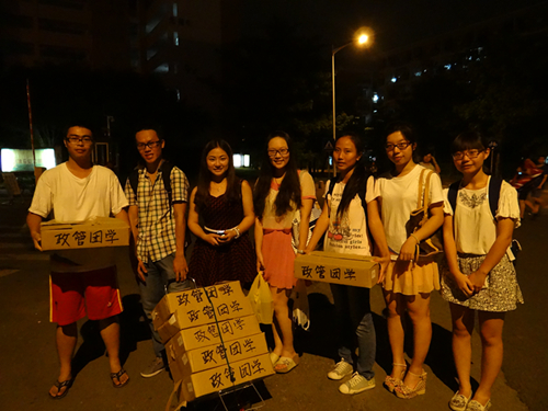 晚上七点左右,政管团学的几位代表已经领到月饼,在前往军训慰问的路上。途中,突然狂风大作下起倾盆大雨,一行人在慌乱中撑起雨伞、挡住月饼,不抱怨也不退缩,反而担心起新生们是否军训、而如果军训又是否淋湿起来。